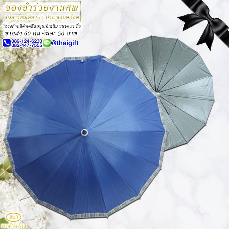 ของชำร่วยงานศพ ร่มยาวตอนเดียว ขอบลายสก๊อต น้ำเงิน